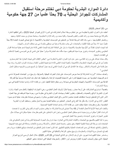 ةرﺋادﻟا ﺎﮭﺗﻘﻠطأ ﻲﺗﻟاو ،2025 ﺔﯾﺛﺣﺑﻟا زﺋاوﺟﻠﻟ ﻰﻟوﻷا ةرودﻟا ﻲﻓ تﺎﻛرﺎﺷﻣﻟا مﻼﺗﺳا ﺔﻠﺣرﻣ مﺎﺗﺗﺧا نﻋ ﻲﺑد ﺔﻣوﻛﺣﻟ ﺔﯾرﺷﺑﻟا دراوﻣﻟا ةرﺋاد تﻧﻠﻋأ