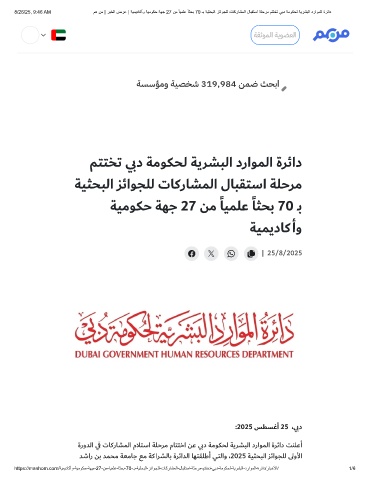 8/26/25, 9:46 AM مھ نﻣ | رﺑﺧﻟا ضرﻋ | ﺔﯾﻣﯾدﺎﻛأو ﺔﯾﻣوﻛﺣ ﺔﮭﺟ 27 نﻣ ً ﺎﯾﻣﻠﻋ ً ﺎﺛﺣﺑ 70 ـﺑ ﺔﯾﺛﺣﺑﻟا زﺋاوﺟﻠﻟ تﺎﻛرﺎﺷﻣﻟا لﺎﺑﻘﺗﺳا ﺔﻠﺣرﻣ مﺗﺗﺧﺗ ﻲﺑد ﺔﻣوﻛﺣﻟ ﺔﯾرﺷﺑﻟا دراوﻣﻟا ةرﺋاد