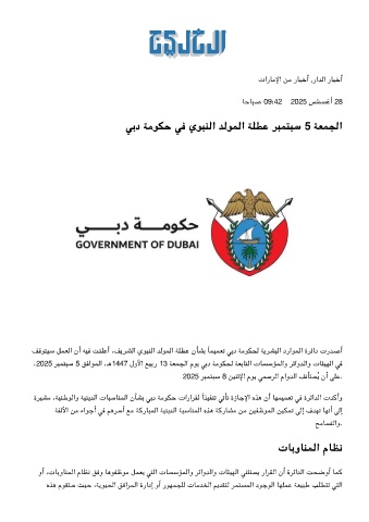 ،2025 ﺮﺒﻤﺘﺒﺳ 5 ﻖﻓاﻮﻤﻟا ،ـﻫ1447 لوﻷا ﻊﻴﺑر 13 ﺔﻌﻤﺠﻟا مﻮﻳ ﺑد ﺔﻣﻮﺤﻟ ﺔﻌﺑﺎﺘﻟا تﺎﺴﺳﺆﻤﻟاو ﺮﺋاوﺪﻟاو تﺎﺌﻴﻬﻟا ﻓ