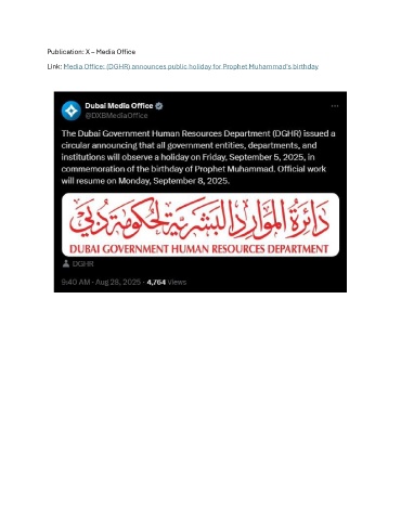 Publication: X – Media Office Link: Media Office: (DGHR) announces public holiday for Prophet Muhammad's birthday