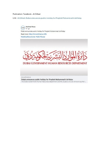 Publication: Facebook – Al Etihad Link: Al Etihad: Dubai announces public holiday for Prophet Muhammad's birthday