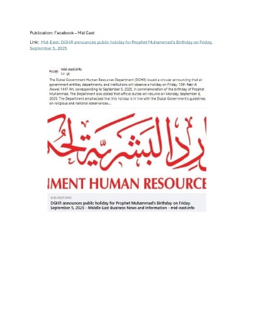 Publication: Facebook – Mid East Link: Mid-East: DGHR announces public holiday for Prophet Muhammad’s Birthday on Friday, September 5, 2025