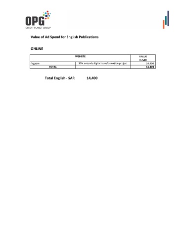Value of Ad Spend for English Publications ONLINE WEBSITE VALUE In SAR Argaam SGH extends digital transformation project 14,400 TOTAL 14,400 Total English - SAR 14,400