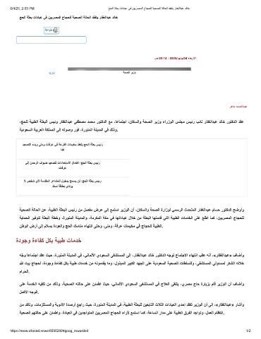 ﻰﻠﻋ ﺔﻣدﺧﻟا ﮫﯾﻘﻠﺗ نﻣ دﻛﺄﺗو ،ﺔﯾﺣﺻﻟا ﮫﺗﻟﺎﺣ ﻰﻠﻋ نﺋﻣطا ثﯾﺣ ،ﻲﻧﺎﻣﻟﻷا يدوﻌﺳﻟا ﻰﻔﺷﺗﺳﻣﻟا ﻲﻓ جﻼﻌﻟا ﻰﻘﻠﺗﯾ ،يرﺻﻣ جﺎﺣ ةرﺎﯾزﺑ مﺎﻗ رﯾزوﻟا نأ فﺎﺿأو