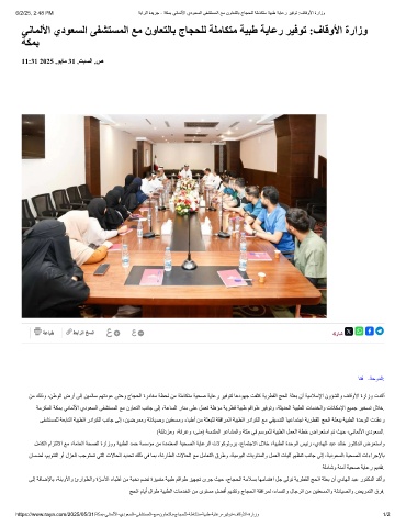6/2/25, 2:48 PM ﺔﯾارﻟا ةدﯾرﺟ - ﺔﻛﻣﺑ ﻲﻧﺎﻣﻟﻷا يدوﻌﺳﻟا ﻰﻔﺷﺗﺳﻣﻟا ﻊﻣ نوﺎﻌﺗﻟﺎﺑ جﺎﺟﺣﻠﻟ ﺔﻠﻣﺎﻛﺗﻣ ﺔﯾﺑط ﺔﯾﺎﻋر رﯾﻓوﺗ :فﺎﻗوﻷا ةرازو