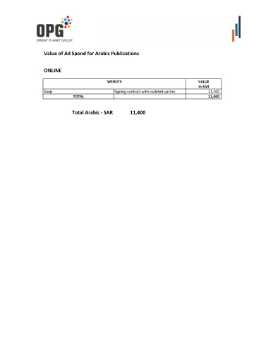 Value of Ad Spend for Arabic Publications ONLINE WEBSITE VALUE In SAR Aleqt Signing contract with realeted parties 11,400 TOTAL 11,400 Total Arabic - SAR 11,400
