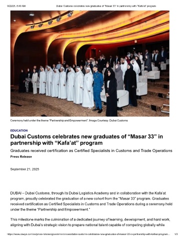 9/22/25, 8:49 AM Dubai Customs celebrates new graduates of “Masar 33” in partnership with “Kafa’at” program