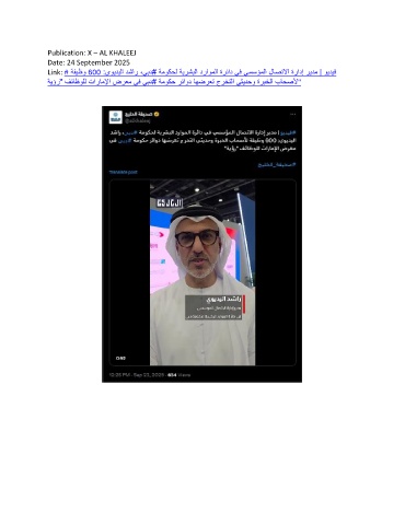 Publication: X – AL KHALEEJ Date: 24 September 2025 Link: # ةفيظو 600 :يويديلا دشار ،يبد# ةموكحل ةيرشبلا دراوملا ةرئاد يف يسسؤملا لاصتلاا ةرادإ ريدم | ويديف ةيؤر" فئاظولل تاراملإا ضرعم يف يبد# ةموكح رئاود اهضرعت جرختلا يثيدحو ةربخلا باحصلأ"