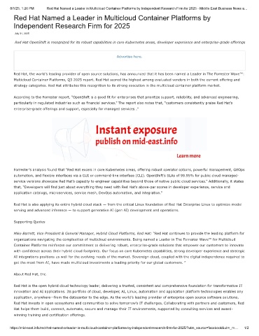 8/1/25, 1:26 PM Red Hat Named a Leader in Multicloud Container Platforms by Independent Research Firm for 2025 - Middle East Business News a…