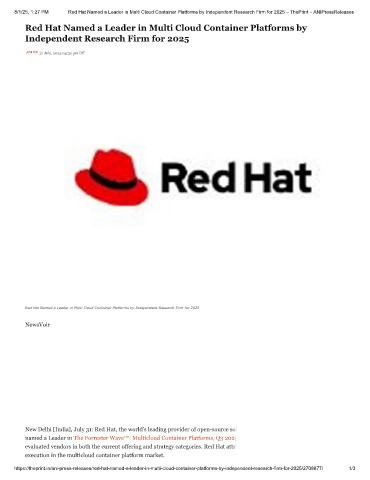8/1/25, 1:27 PM Red Hat Named a Leader in Multi Cloud Container Platforms by Independent Research Firm for 2025 – ThePrint – ANIPressReleases