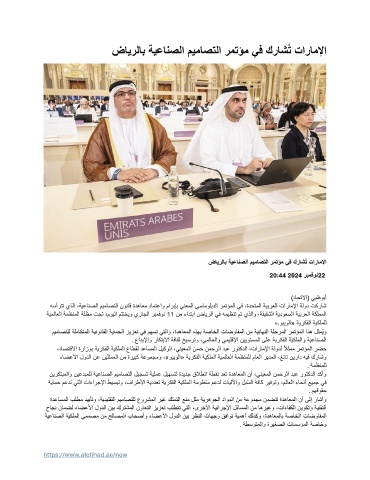هسأرتت يذلا ،ةيعانصلا ميماصتلا نوناق ةدهاعم دامتعاو ماربإب ينعملا يسامولبدلا رمتؤملا يف ،ةدحتملا ةيبرعلا تاراملإا ةلود تكراش