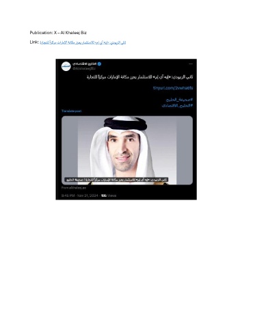 Publication: X – Al Khaleej Biz ً Link: ةراجتلل ازكرم تاراملإا ةناكم ززعي رامثتسلال »مإ يآ هيإ« :يدويزلا يناث