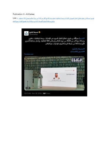 Publication: X – Al Khaleej Link: # ..ةيقافتا 189 يلامجإب ملاعلا لود نم %90 نم رثكأ عم ةكارشو نواعت تايقافتاب طبتري تاراملإا يف يوجلا لقنلا عاطق :قوط نب اللهدبع |ويديف ُ ملاعلا عم تاراملإل يوجلا طبرلا ةكبش نم %13 طسولأا قرشلا ةقطنم لثمتو