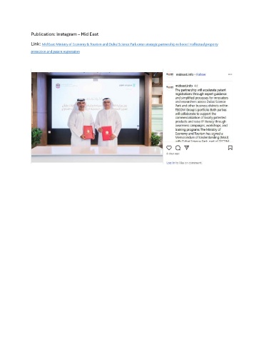 Publication: Instagram – Mid East Link: Mid East: Ministry of Economy & Tourism and Dubai Science Park enter strategic partnership to boost intellectual property protection and patent registration