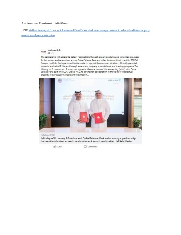 Publication: Facebook – Mid East Link: Mid East: Ministry of Economy & Tourism and Dubai Science Park enter strategic partnership to boost intellectual property protection and patent registration