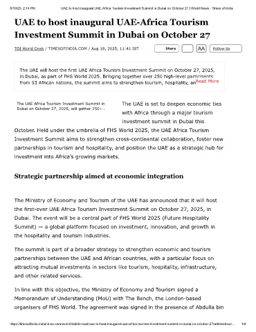 8/19/25, 2:14 PM UAE to host inaugural UAE-Africa Tourism Investment Summit in Dubai on October 27 | World News - Times of India