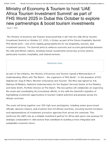 8/18/25, 1:56 PM Ministry of Economy & Tourism to host ‘UAE Africa Tourism Investment Summit’ as part of FHS World 2025 in Dubai this October to…