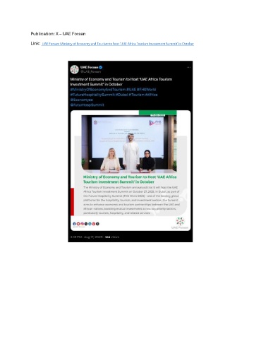 Publication: X – UAE Forsan Link: UAE Forsan: Ministry of Economy and Tourism to host ‘UAE Africa Tourism Investment Summit’ in October