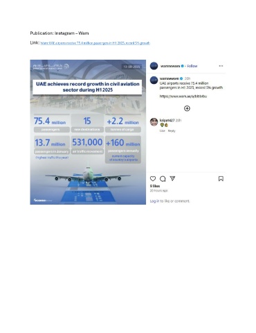 Publication: Instagram – Wam Link: Wam: UAE airports receive 75.4 million passengers in H1 2025, record 5% growth