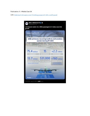 Publication: X – Middle East 24 Link: Middle East 24: UAE airports receive 75.4 million passengers in H1 2025, record 5% growth