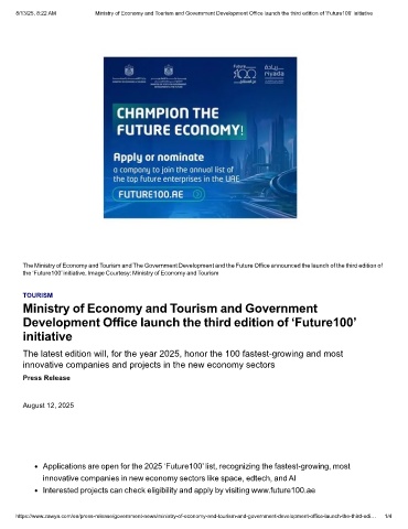 8/13/25, 8:22 AM Ministry of Economy and Tourism and Government Development Office launch the third edition of ‘Future100’ initiative