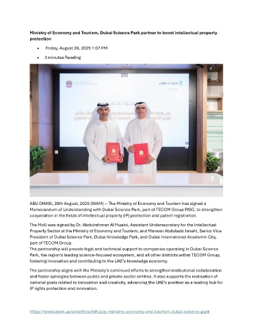 Ministry of Economy and Tourism, Dubai Science Park partner to boost intellectual property