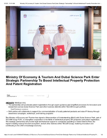 https://menafn.com/1109994973/Ministry-Of-Economy-Tourism-And-Dubai-Science-Park-Enter-Strategic-Partnership-To-Boost-Intellectual-Property-Pr… 1/2