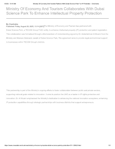 9/3/25, 10:16 AM Ministry Of Economy And Tourism Partners With Dubai Science Park For IP Protection - OneArabia