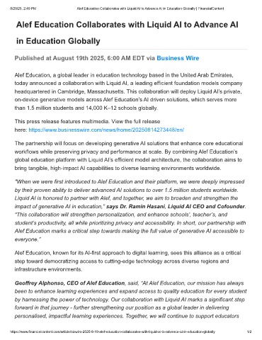 8/20/25, 2:49 PM Alef Education Collaborates with Liquid AI to Advance AI in Education Globally | FinancialContent