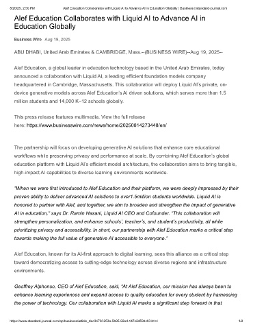 8/20/25, 2:50 PM Alef Education Collaborates with Liquid AI to Advance AI in Education Globally | Business | standard-journal.com