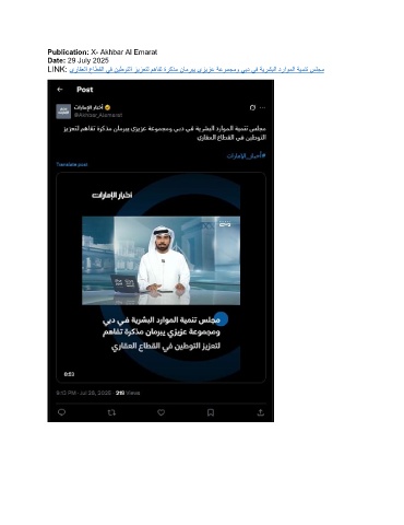 Publication: X- Akhbar Al Emarat Date: 29 July 2025 LINK: يرﺎﻘﻌﻟا عﺎطﻘﻟا ﻲﻓ نﯾطوﺗﻟا زﯾزﻌﺗﻟ مھﺎﻔﺗ ةرﻛذﻣ نﺎﻣرﺑﯾ يزﯾزﻋ ﺔﻋوﻣﺟﻣو ﻲﺑد ﻲﻓ ﺔﯾرﺷﺑﻟا دراوﻣﻟا ﺔﯾﻣﻧﺗ سﻠﺟﻣ