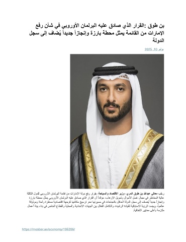 ةثلاثلا لودلل يبورولأا ناملربلا ةمئاق نم تاراملإا ةلود عفر رارقب ،ةحايسلاو داصتقلاا ريزو ،يرملا قوط نب اللهدبع يلاعم بَّحر
