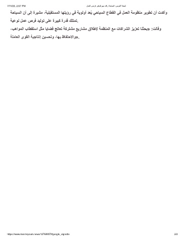 ﺔﺣﺎﯾﺳﻟا نأ ﻰﻟإ ةرﯾﺷﻣ ،ﺔﯾﻠﺑﻘﺗﺳﻣﻟا ﺎﮭﺗﯾؤر ﻲﻓ ﺔﯾوﻟوأ دﻌُﯾ ﻲﺣﺎﯾﺳﻟا عﺎطﻘﻟا ﻲﻓ لﻣﻌﻟا ﺔﻣوظﻧﻣ رﯾوطﺗ نأ تدﻛأو