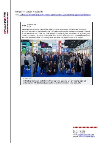 Publication: Facebook -mid-east.info Title: Technology demands and AI investments power Centena Group’s strong regional performance Tel: 971 4 4546093 Fax: 971 4 3612432 E-mail: info@communigateme.com Website: www.communigateme.com