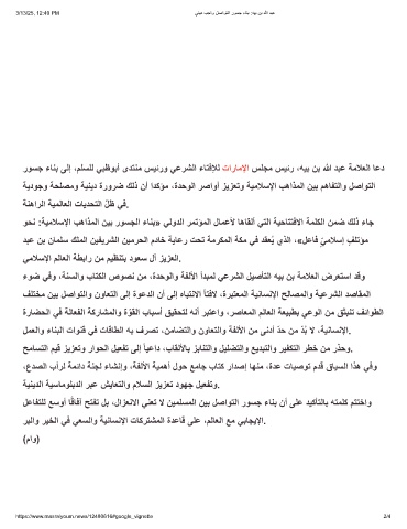 لﻋﺎﻔﺗﻠﻟ ﻊﺳوأ ﺎﻗﺎﻓآ ﺢﺗﻔﺗ لﺑ ،لازﻌﻧﻻا ﻲﻧﻌﺗ ﻻ نﯾﻣﻠﺳﻣﻟا نﯾﺑ لﺻاوﺗﻟا روﺳﺟ ءﺎﻧﺑ نأ ﻰﻠﻋ دﯾﻛﺄﺗﻟﺎﺑ ﮫﺗﻣﻠﻛ مﺗﺗﺧاو