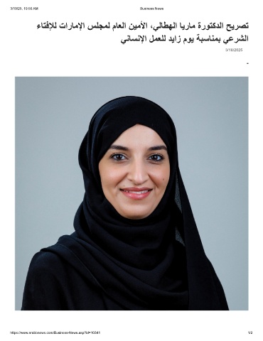 3/19/25, 10:56 AM Business News ءﺎﺗﻓﻺﻟ تارﺎﻣﻹا سﻠﺟﻣﻟ مﺎﻌﻟا نﯾﻣﻷا ،ﻲﻟﺎطﮭﻟا ﺎﯾرﺎﻣ ةروﺗﻛدﻟا ﺢﯾرﺻﺗ ﻲﻧﺎﺳﻧﻹا لﻣﻌﻠﻟ دﯾاز موﯾ ﺔﺑﺳﺎﻧﻣﺑ ﻲﻋرﺷﻟا 3/18/2025 - https://www.arabbnews.com/Business-News.asp?id=10341 1/2