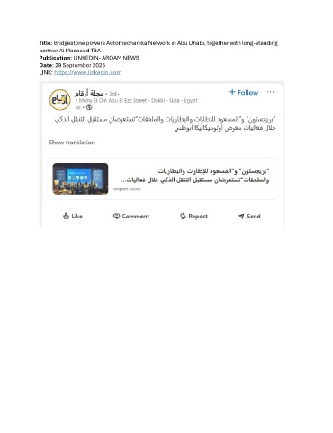 Title: Bridgestone powers Automechanika Network in Abu Dhabi, together with long-standing partner Al Masaood TBA Publication: LINKEDIN- ARQAM NEWS Date: 29 September 2025 LINK: https://www.linkedin.com