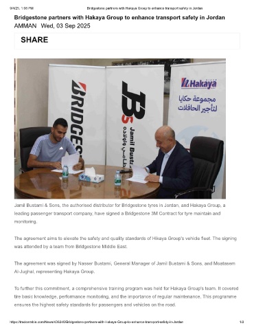 https://tradearabia.com/News/436240/Bridgestone-partners-with-Hakaya-Group-to-enhance-transport-safety-in-Jordan 1/2
