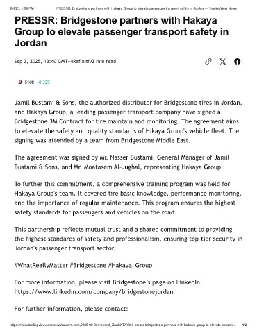 9/4/25, 1:09 PM PRESSR: Bridgestone partners with Hakaya Group to elevate passenger transport safety in Jordan — TradingView News