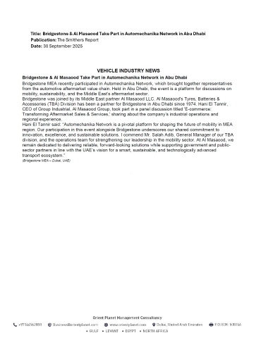 Title: Bridgestone & Al Masaood Take Part in Automechanika Network in Abu Dhabi Publication: The Smithers Report Date: 30 September 2025