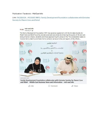 Publication: Facebook – Mid East Info Link: FACEBOOK - MID EAST INFO: Family Development Foundation collaborates with Emirates Society for Parent Care and Relief