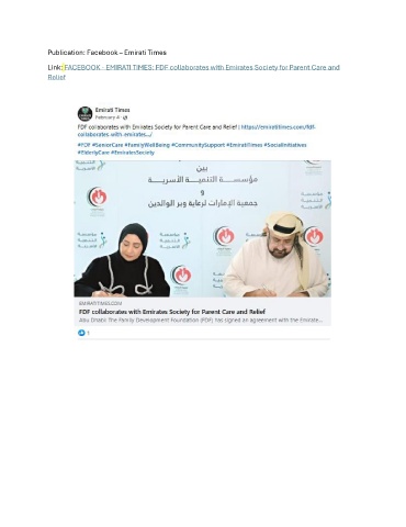 Publication: Facebook – Emirati Times Link: FACEBOOK - EMIRATI TIMES: FDF collaborates with Emirates Society for Parent Care and Relief