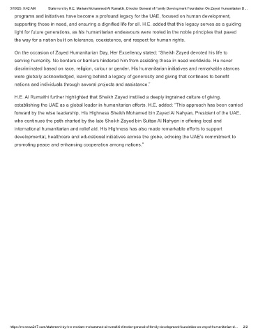 3/19/25, 9:42 AM Statement by H.E. Mariam Mohammed Al Rumaithi, Director General of Family Development Foundation On Zayed Humanitarian D…