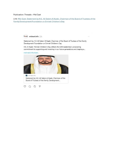 Publication: Threads – Mid East Link: Mid-East: Statement by H.E. Ali Salem Al Kaabi, Chairman of the Board of Trustees of the Family Development Foundation on Emirati Children’s Day