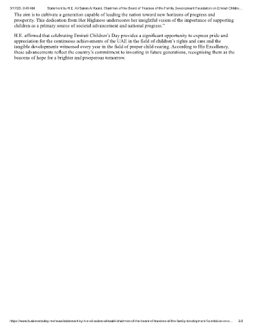 3/17/25, 9:49 AM Statement by H.E. Ali Salem Al Kaabi, Chairman of the Board of Trustees of the Family Development Foundation on Emirati Childre…