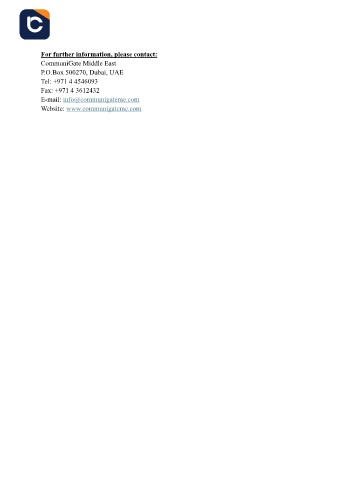 For further information, please contact: CommuniGate Middle East P.O.Box 500270, Dubai, UAE Tel: +971 4 4546093 Fax: +971 4 3612432 E-mail: info@communigateme.com Website: www.communigateme.com