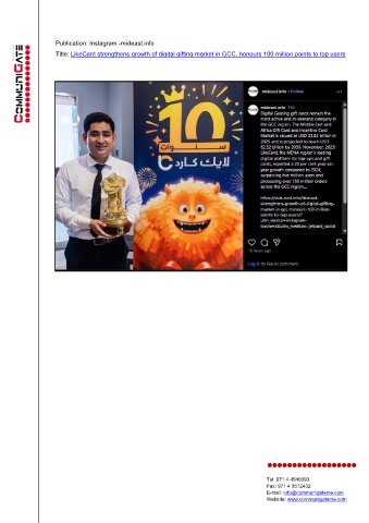 Publication: Instagram -mideast.info Title: LikeCard strengthens growth of digital gifting market in GCC, honours 100 million points to top users Tel: 971 4 4546093 Fax: 971 4 3612432 E-mail: info@communigateme.com Website: www.communigateme.com