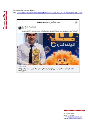 Publication: Facebook -Leb4tech Title: LikeCard strengthens growth of digital gifting market in GCC, honours 100 million points to top users Tel: 971 4 4546093 Fax: 971 4 3612432 E-mail: info@communigateme.com Website: www.communigateme.com