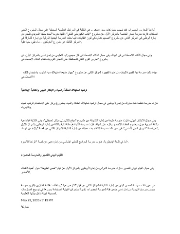 لوﻷا زﻛرﻣﻟﺎﺑ ﻲﺑظوﺑأ ةرﺎﻣإ نﻣ ﺔﺛﻟﺎﺛو ﺔﯾﻧﺎﺛ ﺔﻘﻠﺣ ﺦﻣاوﺷﻟا ﺔﺳردﻣ تزﺎﻓ ،ﺔﺋﯾﺑﻟا ﻰﻠﻋ هرﺛأو رﺿﺧﻷا ءﺎطﻐﻟا عوﺿوﻣ لوﺣ ﺔﯾﺑرﻌﻟا ﺔﻐﻠﻟﺎﺑ