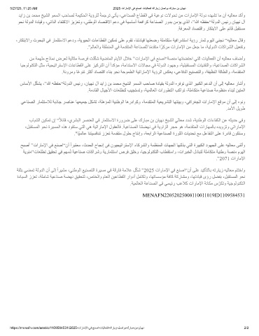 ﺔﻘﺜﺑ ﻲﻀﻤﺗ ﺔﻟوﺪﻟا نأ ﻰﻟإ ًاﺮﯿﺸﻣ ،ﻲﻨطﻮﻟا ﻊﯿﻨﺼﺘﻟا ةﺮﯿﺴﻣ ﻲﻓ ﺔﻗرﺎﻓ ﺔﻣﻼﻋ ﻞّﻜﺷ ”2025 تارﺎﻣﻹا ﻲﻓ ﻊﻨﺻا“نأ ﻰﻠﻋ ﺪﯿﻛﺄﺘﻟﺎﺑ ﮫﺗرﺎﯾز ﮫﯿﻟﺎﻌﻣ ﻢﺘﺘﺧاو